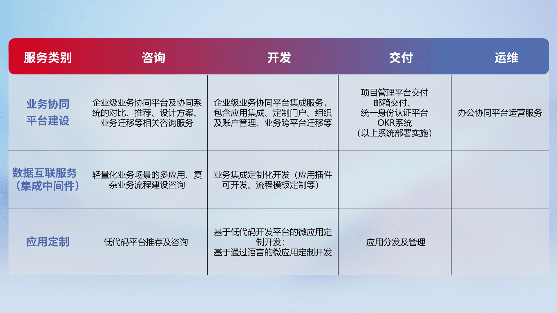 针对钉钉、、、企微、、、、IDaas等平台级产品提供产品的规划、、方案、、、、交付、、定制化开发等服务,,,实现如统一协同办公、、、智能客户服务、、、、混合会议管理、、、智能数据查询、、等业务场景,,实现数字化转型。。。。